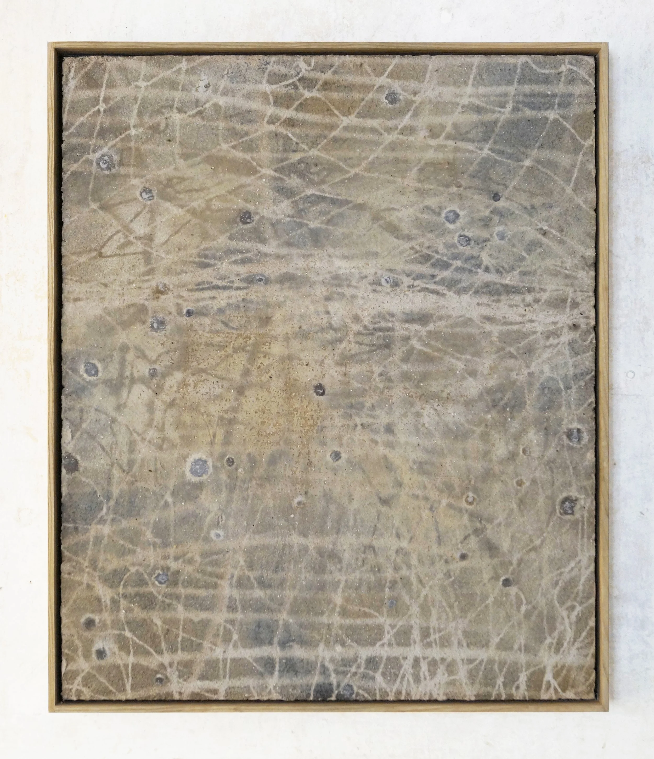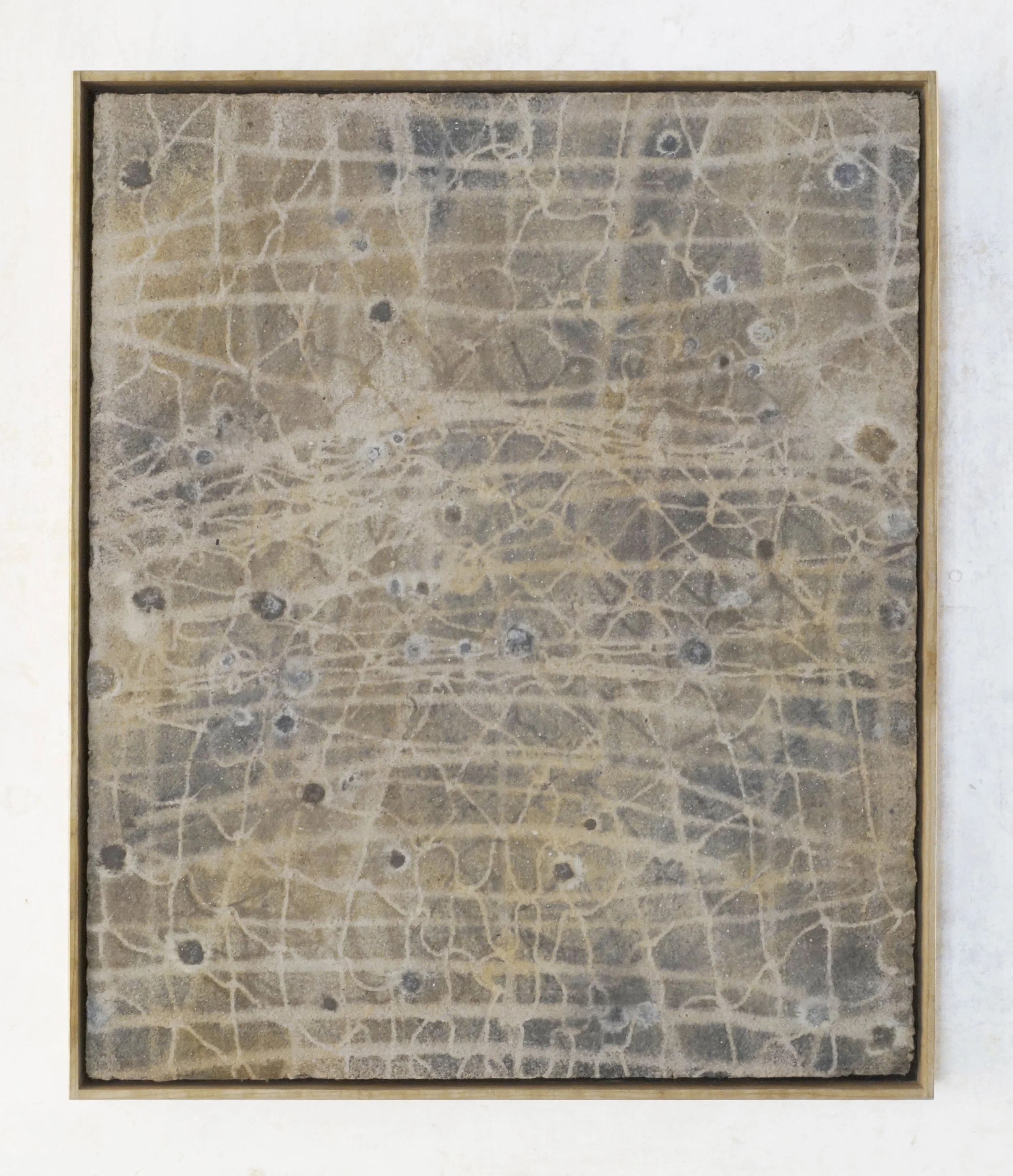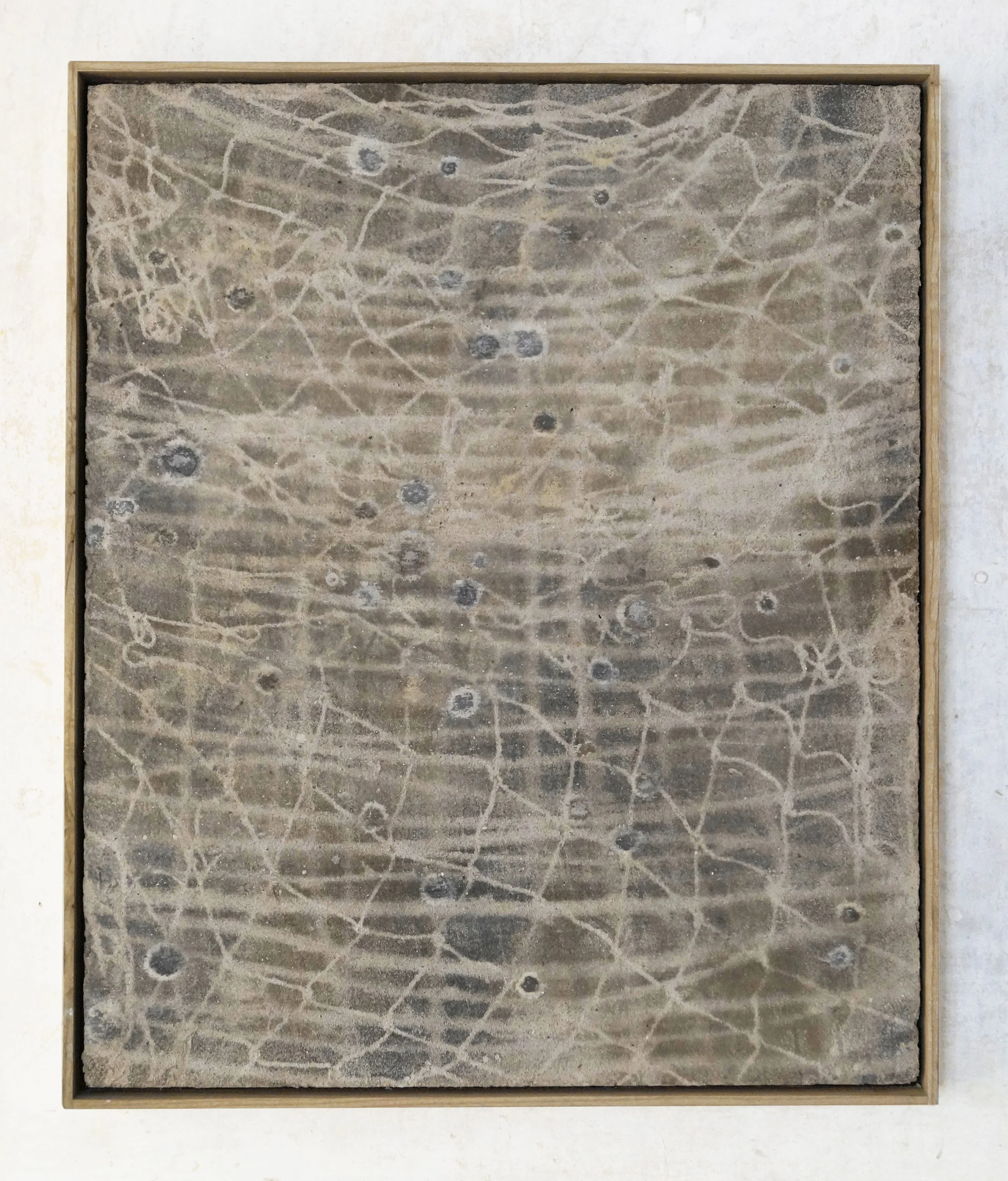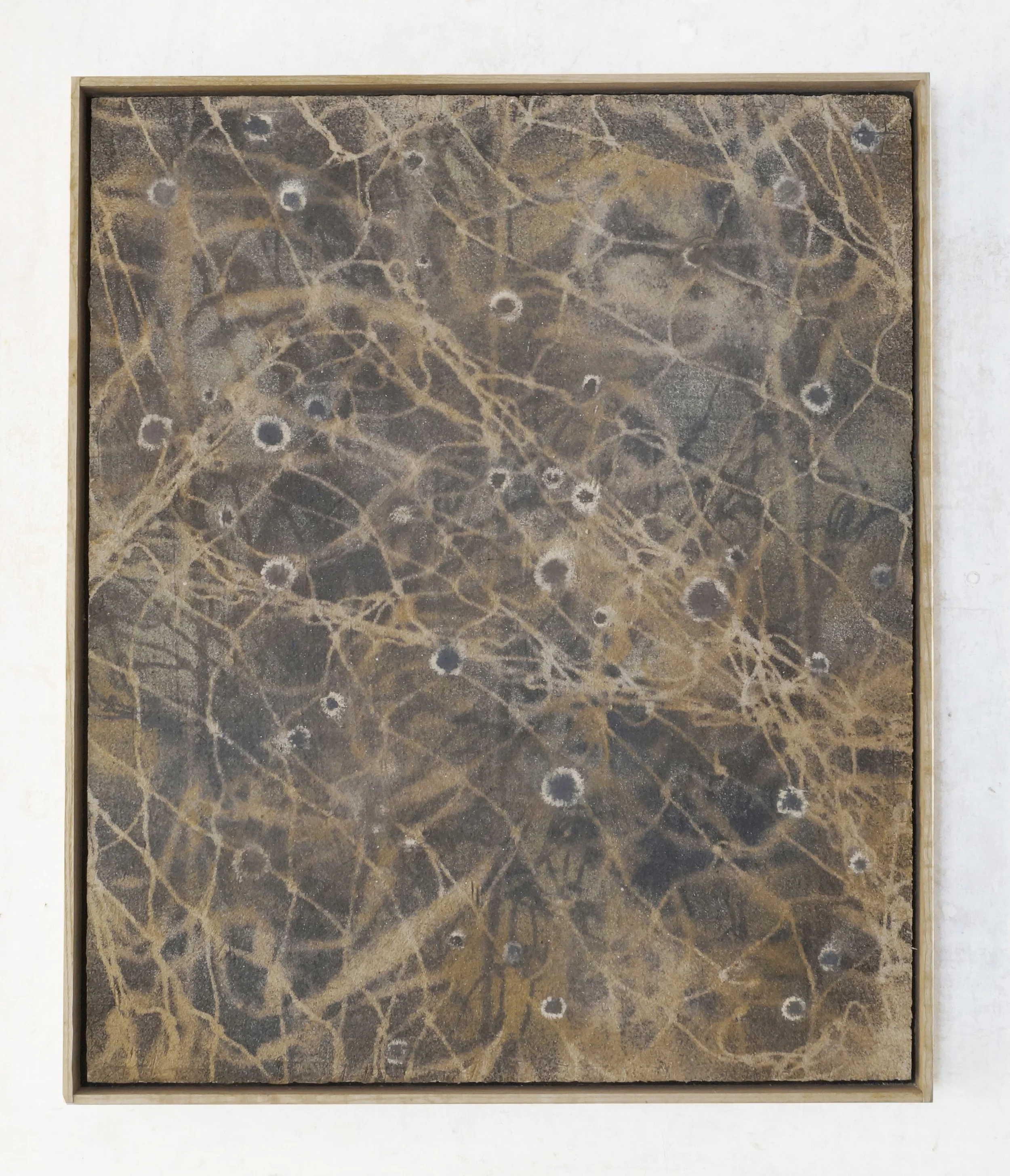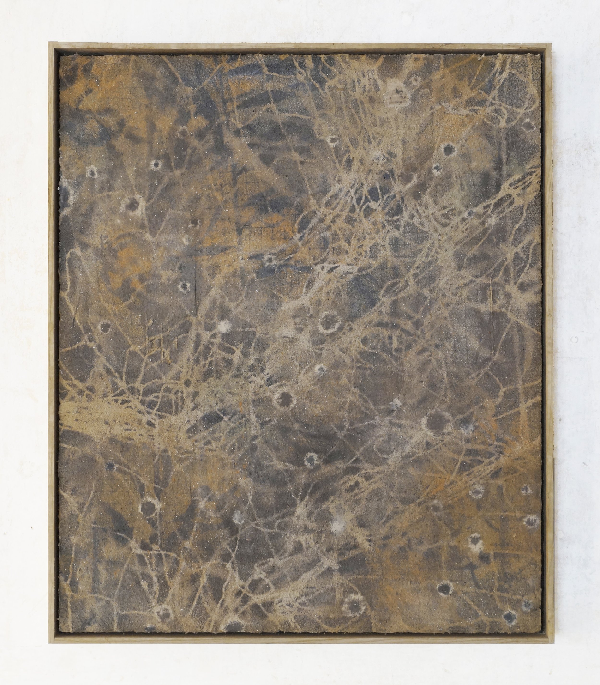 Earth and cosmic pigments, sand, lime on board, framed in ash